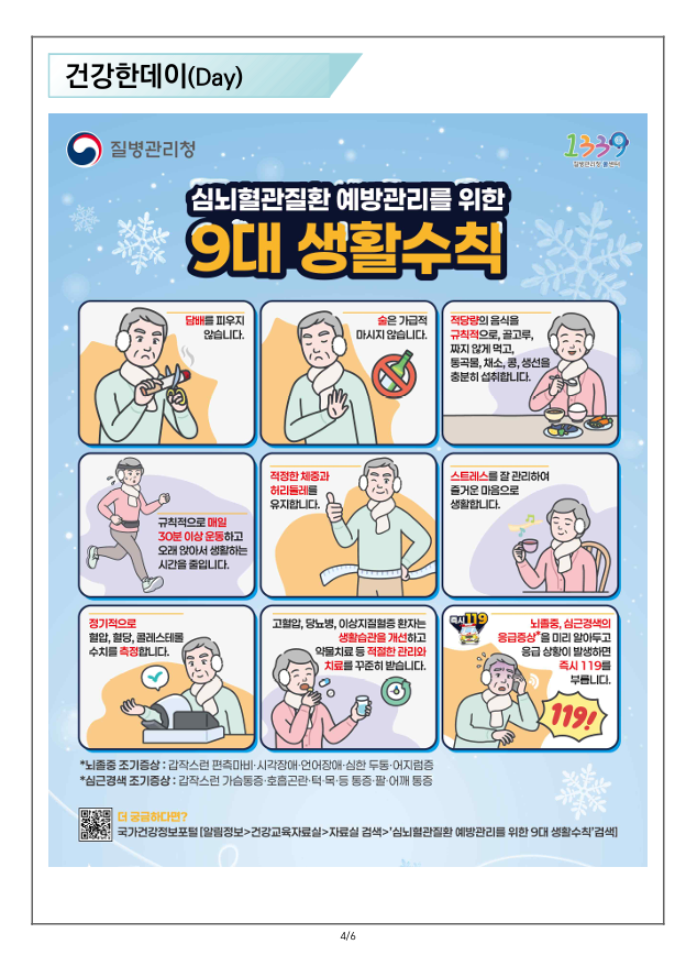 | 제목 | 건강한데이(Day_심뇌혈관질환 예방관리를 위한 9대 생활수칙) | 공지일 | 2026.02.12 |